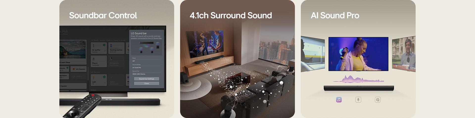 Simple, smart control on compatible LG TVs for modes, sound profiles, and more.